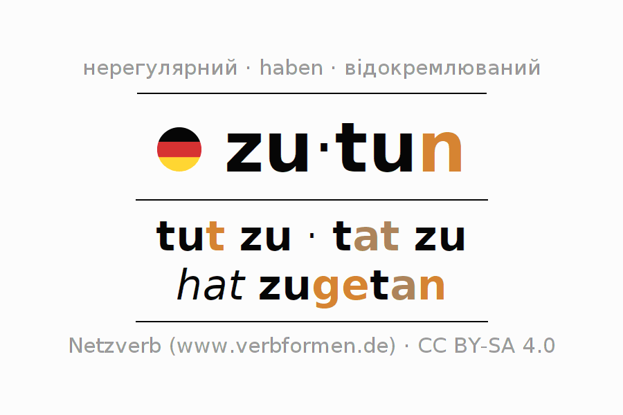 Форми відмінювання zutun (додавати, закривати) в наказовому способі: tue (du) zu, tun wir zu, tut (ihr) zu, tun Sie zu