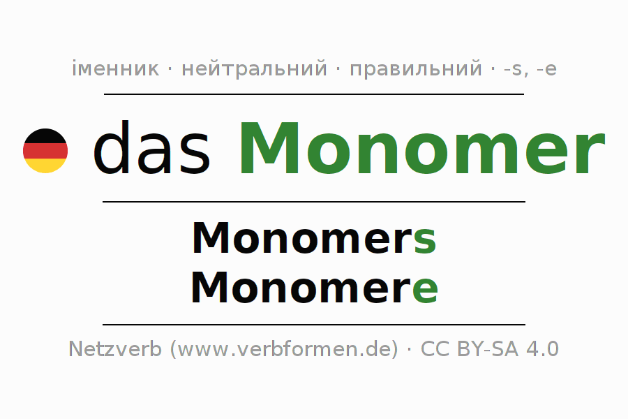 Відмінювання іменника Monomer (мономер) подається у родовому відмінку однини Monomers та у називному відмінку множини Monomere. Іменник Monomer відмінюється за сильною відміною з закінченнями s/e. Граматичний рід Monomer — середній, і означений артикль — "das". Тут можна відмінювати не лише Monomer, а й усі німецькі іменники. Коментарі ☆